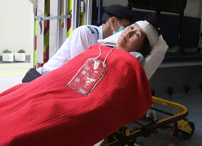 其中一名航機女搭客頭部受傷,需躺在擔架牀送院治理。資料圖片