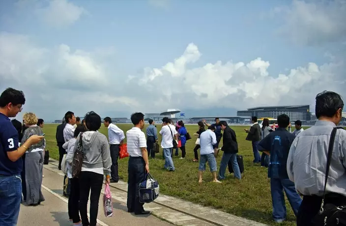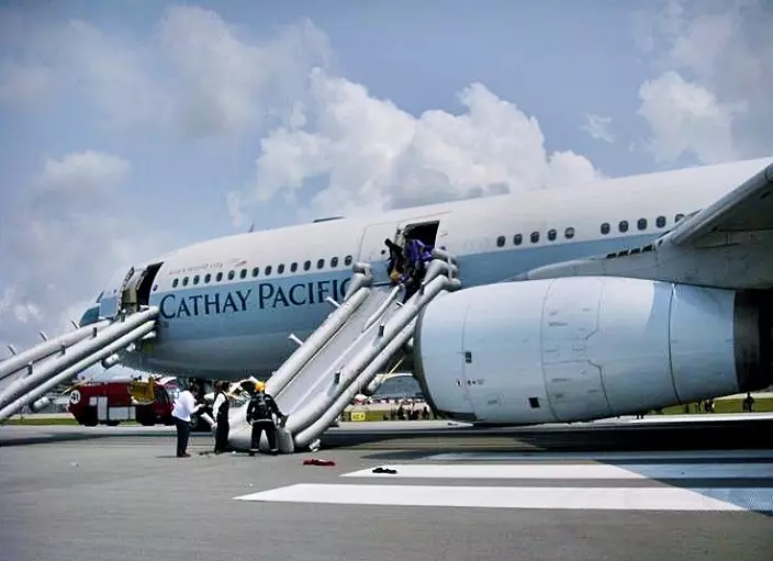 與此同時,該機8條緊急氣墊滑梯全部彈出,機長宣布飛機有問題,要求乘客由機組人員安排協助跳落滑梯疏散。300多名乘客和機組人員先後跳落滑梯,有乘客稱,由於人數太多,而且時間緊急,情況混亂。疏散期間,共有57名乘客受傷,大部分屬輕傷。