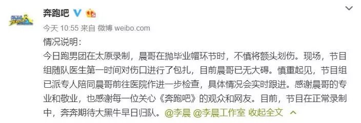 《奔跑吧》今日在太原的迎澤公園進行拍攝,期間中李晨意外受傷,而《奔跑吧》的官方社交平台帳號及後亦發文確認消息。官方指李晨受傷後,隨隊醫生馬上為他包紮傷口,目前他已無大礙,但謹慎起見還是在工作之員的陪同下到醫院檢查,又寫道:「感謝晨哥的專業和敬業,也感謝每一位關心《奔跑吧》的觀眾和網友。期待大黑牛(李晨外號)早日歸隊。」