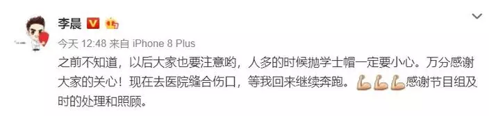 李晨後來亦在社交平台上發文報平安,表示到醫院縫合傷口後就會回到劇組繼續拍攝。他又以自身例子提醒即將畢業的同學拋四方帽一定要小心。而李晨受傷的照片亦隨即在網上瘋傳,可見他額頭左方有一道目測近兩厘米的傷口,但看上去不太嚴重。