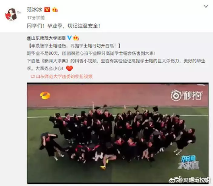 不少粉絲都紛紛留言祝福他早日康復,同時又瘋狂「召喚」其女友范冰冰,指:「不知道范爺該有多心疼啊!」經過網友一番「努力」後,范冰冰亦終於發文回應:「同學們!畢業季,切記注意安全!」