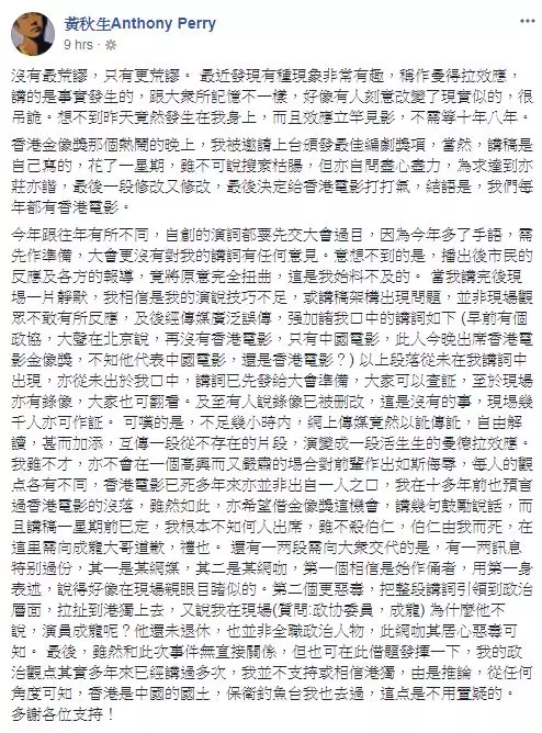 秋生還透露他的演詞要經大會過目,大會也沒有對他的講詞有任何意見,「意想不到的是,播出後市民的反應及各方的報導,竟將原意完全扭曲,這是我始料不及的。 當我講完後現埸一片靜默,我相信是我的演說技巧不足,或講稿架構出現問題,並非現場觀眾不敢有所反應,及後經傳媒廣泛誤傳,强加諸我口中的講詞如下 (早前有個政協,大聲在北京說,再沒有香港電影,只有中國電影,此人今晚出席香港電影金像獎,不知他代表中國電影,還是香港電影?)以上段落從未在我講詞中出現,亦從未出於我口中,講詞已先發給大會準備,大家可以查証,至於現場亦有錄像,大家也可翻看。及至有人說錄像已被删改,這是沒有的事,現埸幾千人亦可作証。」