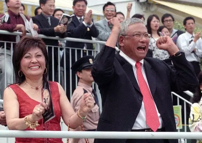 「精英大師」馬主施雅治(右)在愛駒創出連勝17場世界紀錄後,振臂高呼﹝資料圖片﹞