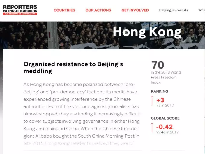 無國界記者組織公布2018年世界新聞自由指數排名,香港排第70位