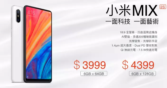 小米MIX 2S採用全熒幕2.0設計,後置相機使用Sony新一代旗艦傳感器IMX363,配合AI技術加強拍照效果。6GB記憶體+64GB內存版只有黑色,售價為3999港元﹔6GB記憶體+128GB內存版設黑色和白色,售價為4399港元。