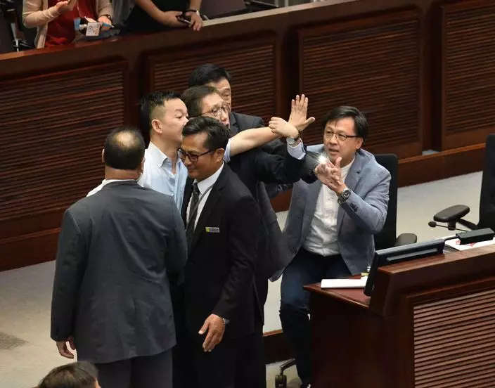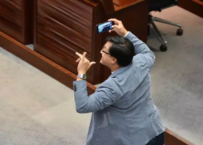 下午五時許,會議進入表決程序,民主派議員突然起立,舉起寫有「割地破壞一國兩制」等的標語,並高呼「割地兩檢違憲」等口號抗議。此時,何君堯其後拿出手機向民主派議員座位方向拍攝,並一度使用閃光燈。