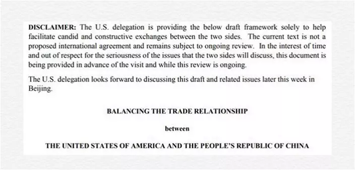 《華爾街日報》公開了美國的談判框架,框架的標題是「平衡中美的貿易關係」,開宗明義就提出,需要立即減少美國對中國的貿易赤字,確保中國市場在公平和非歧視的基礎上,對美國的出口商和投資者開放。