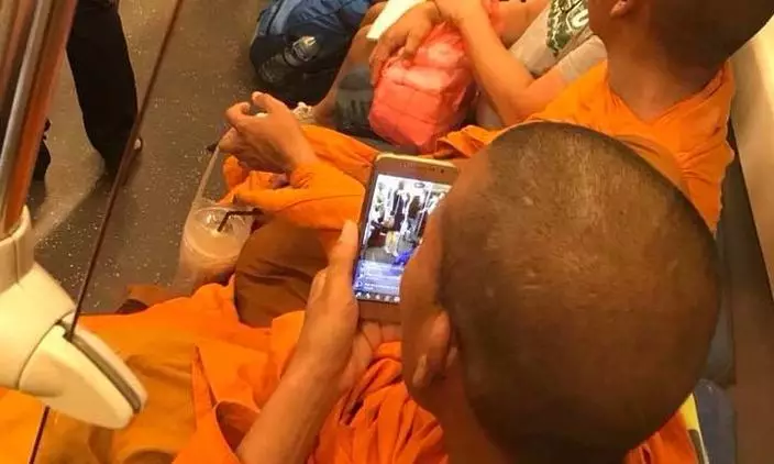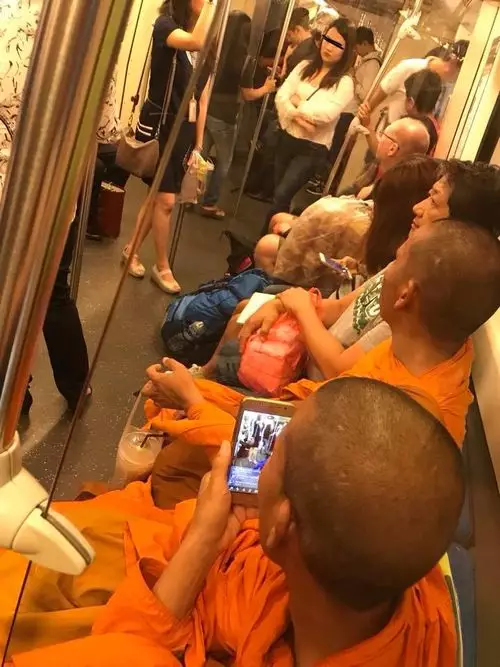 泰國有網民在社交網站發布照片,指兩名和尚搭乘地鐵MRT時,其中一人竟拿出手機,以直播方式偷拍列車上一位站立的女乘客,旁若無人拍攝足五個站。