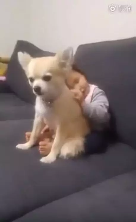 突然,一隻小狗走了過去,在小主人前方坐下,化身暖心小靠枕。其後,女嬰也趴在狗狗的背上香甜地睡著。