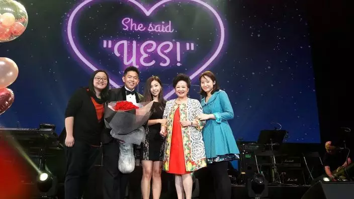 薛家燕(右二)的兒子石耀庭(左二)去年向拍拖兩年的女友Zoe(左三)求婚。(資料圖片)