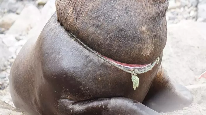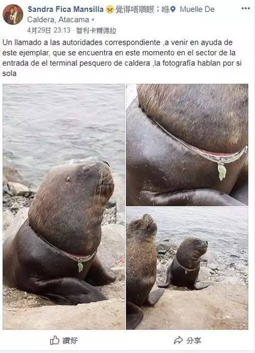 智利港口城市卡爾德拉(Caldera)早前有人發現一隻小海獅遭尼龍繩纏頸,令其頸部皮膚被割開,勒出深深的血痕。