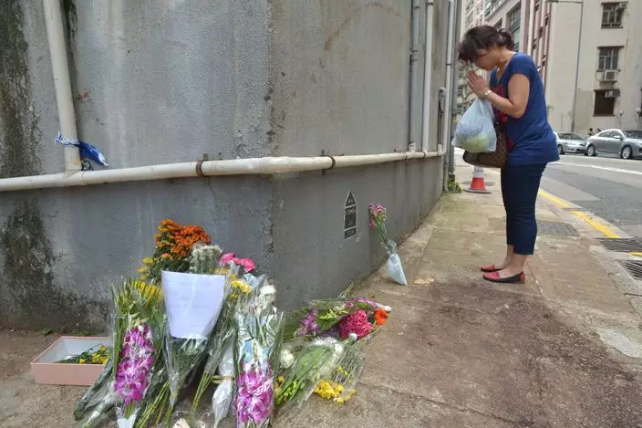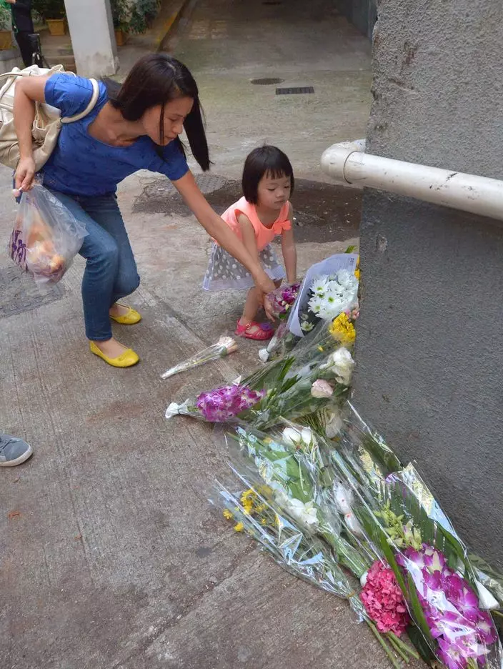 昨多名市民先後到瑞穗證券董事蘇家德懷孕妻張琴遭壓死之羅便臣道悼念,他們向這位捨命護兒偉大母親致意,殺人樹倒下的路面,依稀可見殘留的血跡,伴着逾三十束有心人獻上的鮮花。