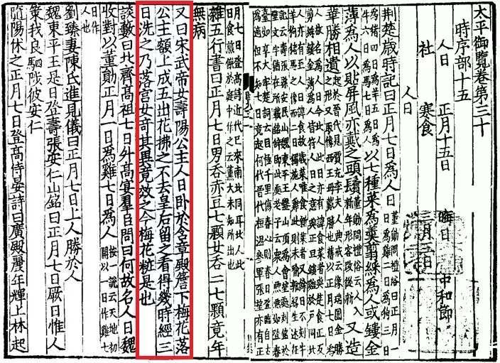 《太平御覽·時序部》引《雜五行書》載,宋武帝劉裕的女兒壽陽公主,正月初七日仰臥於含章殿下,殿前的梅樹被微風一吹,落下一朵梅花,不偏不倚正落在公主額上,額中被染成花瓣狀,且久洗不掉:「經三日洗之乃落,宮女奇其異,競效之」,成為宮中女子爭相效仿的妝扮,稱之為「梅花妝」或「壽陽妝」。