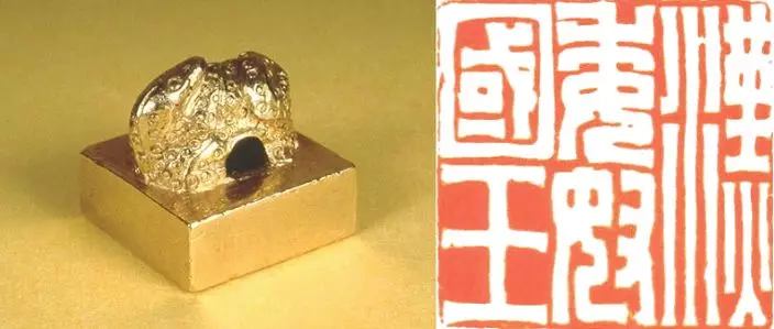 現藏於日本福岡市立博物館的「漢倭奴國王印」及印文 (網上圖片)