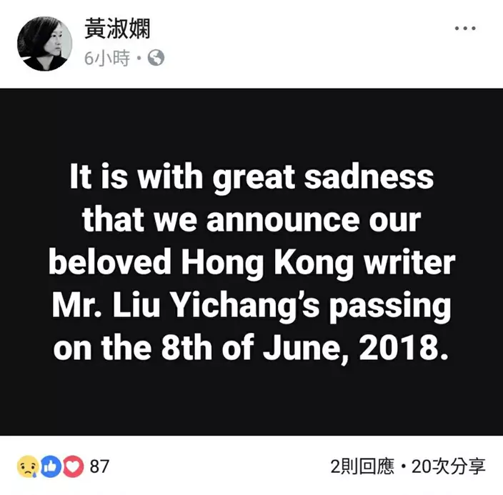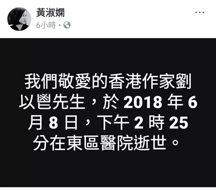 嶺南大學黃淑嫻教授凌晨在其facebook貼文,以中英兩語同時留言,指「我們敬愛的香港作家劉以鬯先生,於2018年6月8日,下午2 時25分在東區醫院逝世。」