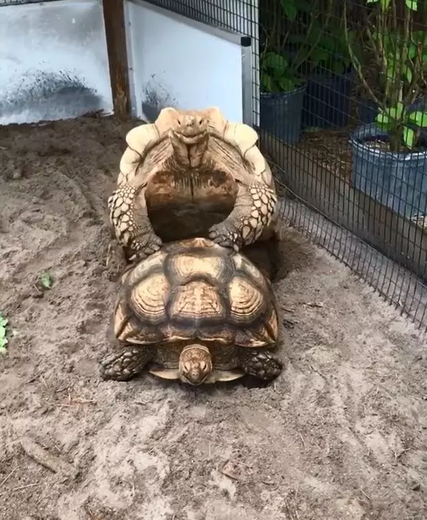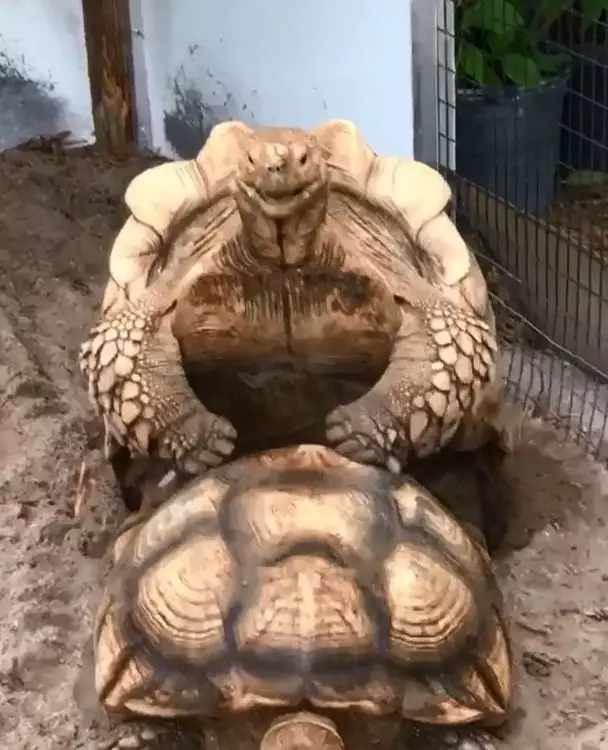 影片中,雄性陸龜騎在雌性陸龜的身上,雖然動作緩慢,但看得出牠還是十分賣力。而令人驚訝的是,雄性陸龜每一下出力,就會發出「WOW」的聲音,有點像「芝麻街」的角色在說話。而動物專家更撰文,指陸龜交配時都喜歡維持這個動作,是因為牠們的身體構造較適合這樣姿勢。