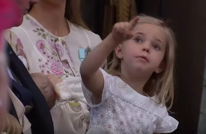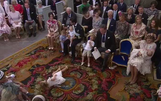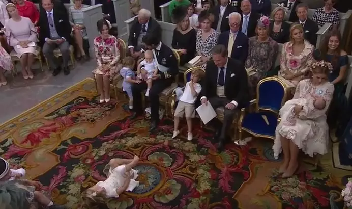 瑞典王室日前為瑪德琳公主(Princess Madeleine)出世3個月的3女兒艾德莉安(Princess Adrienne)小公主舉行受洗儀式,但艾德莉安小公主的4歲姐姐萊奧諾公主(Princess Leonore)因為耐不住冗長沉悶的儀式,無聊得在教堂內「碌地沙」。