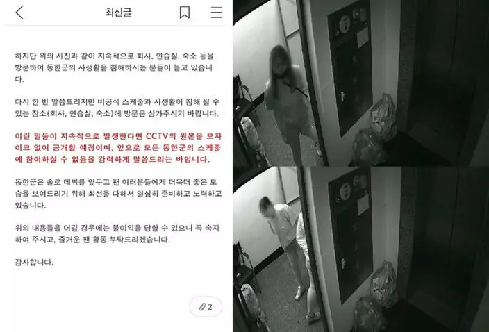 金東漢的公司在官方Cafe貼文,表明「藝人的行程會在後援會、Twitter上公布,粉絲如果來到公司、練習室、宿舍等地方,都是影響藝人私生活的行為。」帖文還附上了兩張閉路電視片段截圖,相中疑似是「私生飯」的一男一女在樓梯間徘徊,並警告:「如果繼續發生這樣的事,下次的照片就不會打馬賽克了。」