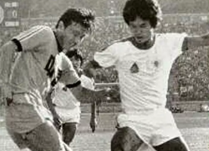 1980年世界盃外圍賽,香港隊對中國隊賽事。右為黎新祥。資料圖片