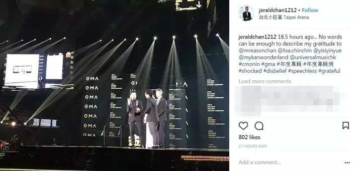 另外,《C mon in~》拿年度專輯大獎,製作人、前Swing成員Jerald Chan(陳哲廬)亦在社交平台感謝Eason及其他工作人員,他留言:「18.5 hours ago... No words can be enough to describe my gratitude to @mreasonchan #cmonin #gma #年度專輯 #年度專輯獎 #shocked #disbelief #speechless #grateful」。