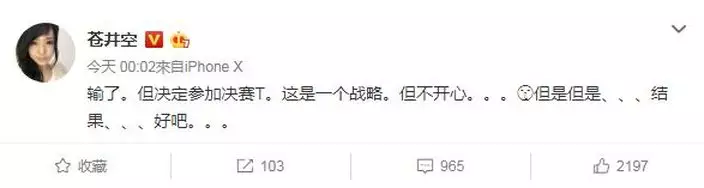 日本隊晉級本來對國民來說絕對值得高興,但欠缺體育精神的表現實在令人失望,令近年對足球非常狂熱的蒼井空也表示非常不爽!她本來看到日本落後時還非常緊張,發文為國家隊打氣,但賽後卻再發文表示失望:「輸了。但決定參加決賽T。這是一個戰略。但不開心。。。但是但是、、、結果、、、好吧。。。」連國民「老師」蒼老師都嬲豬了,