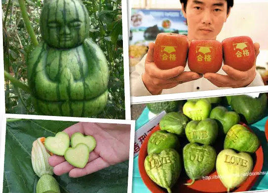 要種出有樣貌瓜果其實不難,只要在植物開始長果實時,將不同形狀的膠膜套在外面,果實便會隨着膠膜外形生長。不同形狀瓜果會被「吊高」價錢出售,一個佛祖西瓜可賣最少150元人民幣。