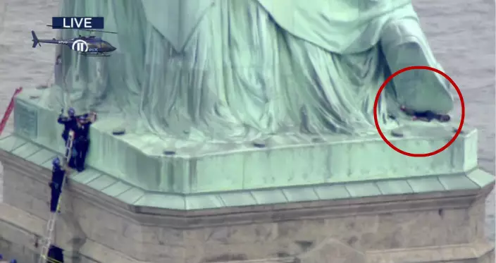 美國一名女子不滿美國移民政策,國慶日爬上自由女神像抗議。