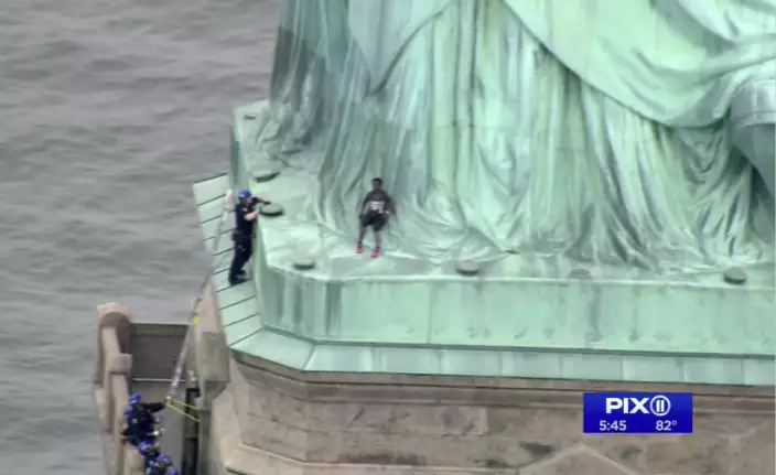 美國國慶日一名黑人女子爬上紐約自由女神像,坐在神像裙腳抗議,不滿政府移民政策。AP圖片
