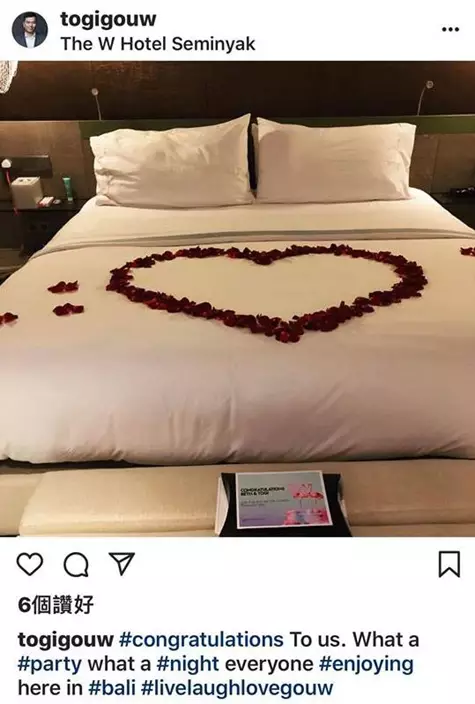 至昨晚,Togi貼上酒店房大床上鋪有紅玫瑰花瓣砌出來的心形圖案,床尾放有酒店的賀卡,寫有「Congratulations Beth & Togi」,還上載老幼在派對活動上跳舞片段。