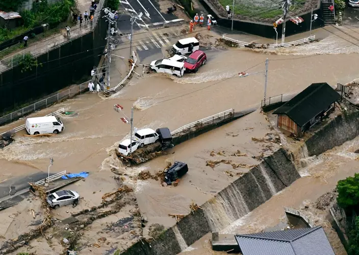 日本西部受暴雨影響,多地出現水災及山泥傾瀉,海陸空交通混亂。