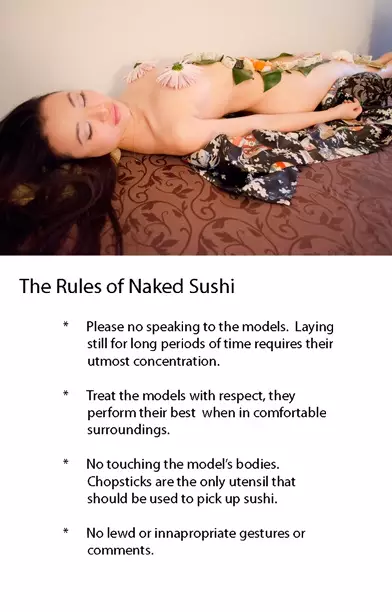 女體盛就是餐廳會用裸體少女作為盛器,在身體上鋪上生魚片和壽司。裸壽司在網站介絡上寫明食客享用女體盛時可以享受到視覺和味覺刺激,是雙重享受,又強調少女身體非常乾淨,作為盛器之前會洗乾淨。不過食客就只能用筷子夾壽司,嚴禁使用其他餐具,而且不可以觸摸模特兒或跟她們交談,任何不禮貌行為也是禁止的。