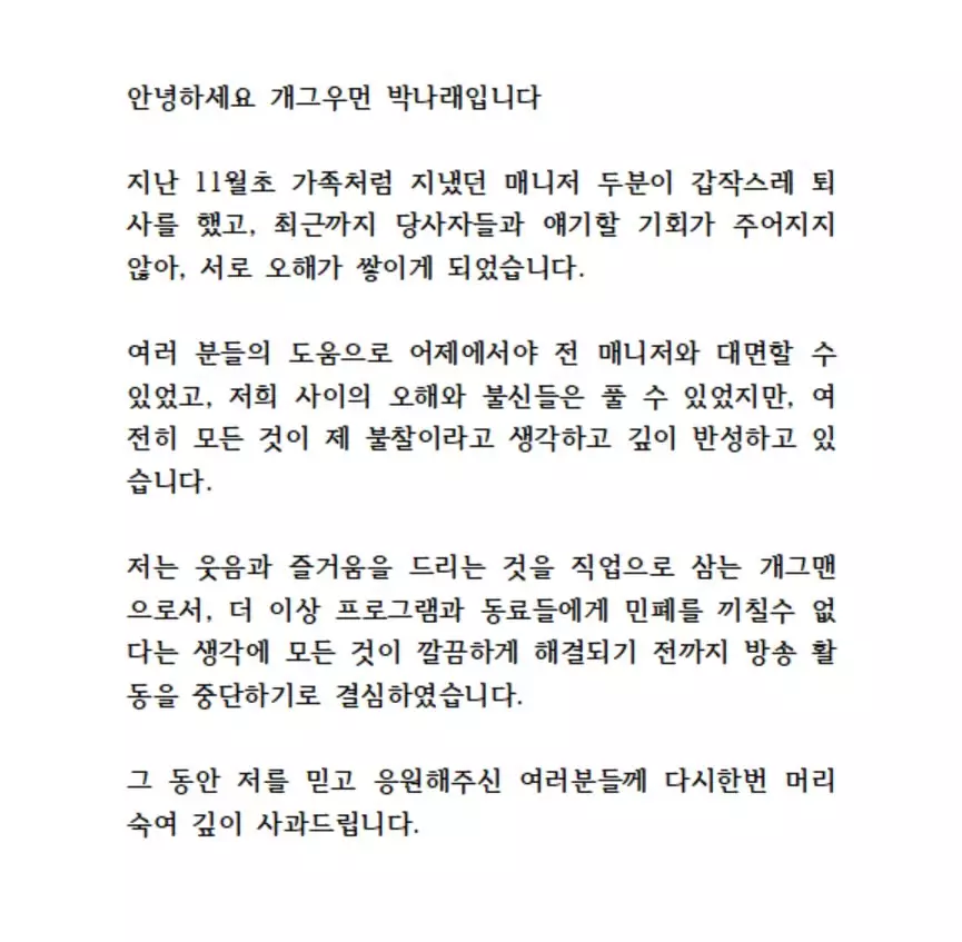 朴娜勑續寫道:「身為以帶給大家歡笑與快樂為職業的喜劇演員,我覺得不能再給節目與同事們帶來困擾,因此決定在所有事情徹底解決之前,暫停一切演藝活動。對於長期以來相信並支持我的各位,再次低頭深深致歉。」