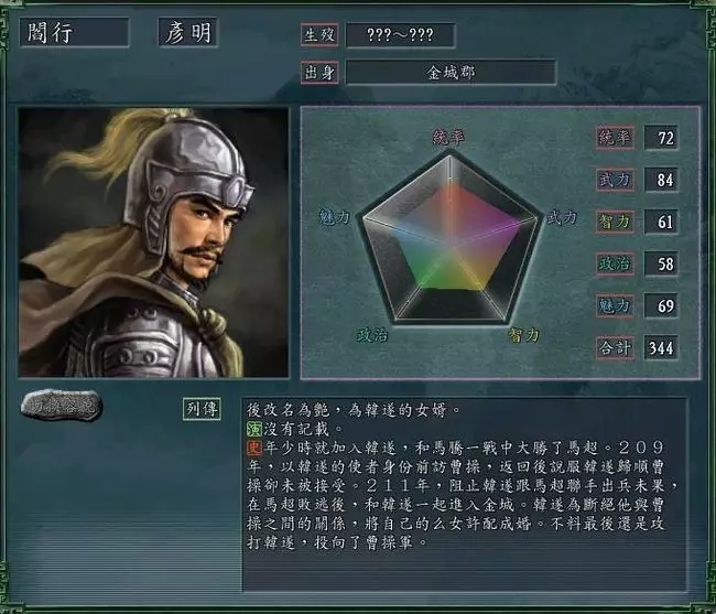 日本遊戲商開發《三國》系列遊戲中的閻行 (網上圖片)