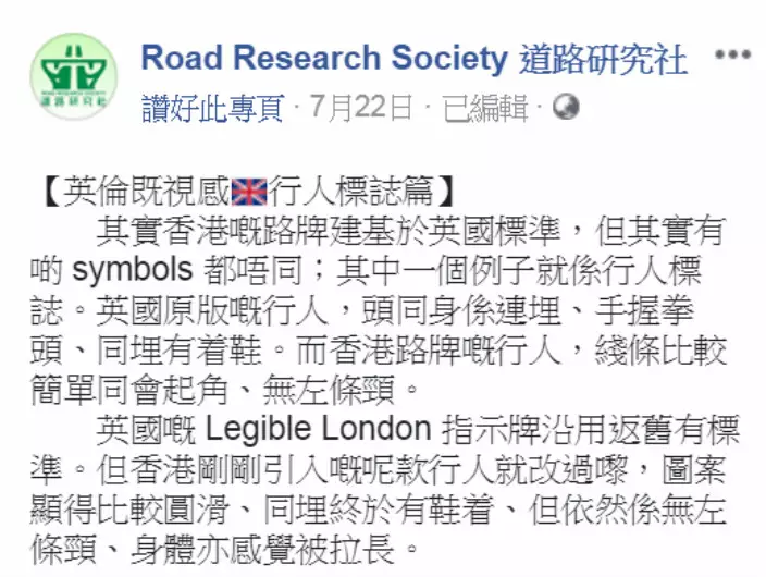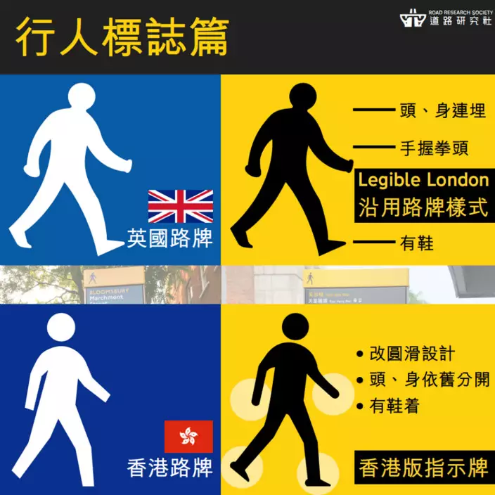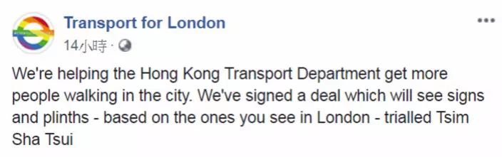 Facebook專頁「Road Research Society 道路硏究社」前日上載圖片,指發現尖沙咀安裝了新款指示牌,「令唔少居英嘅朋友都指非常親切,仿佛返咗倫敦咁,究竟是爲何事?」指無論其排版、配色、行人標誌、字體等,均與倫敦所用的十分相似。其後倫敦交通局昨在Facebook證實有份參與相關設計。