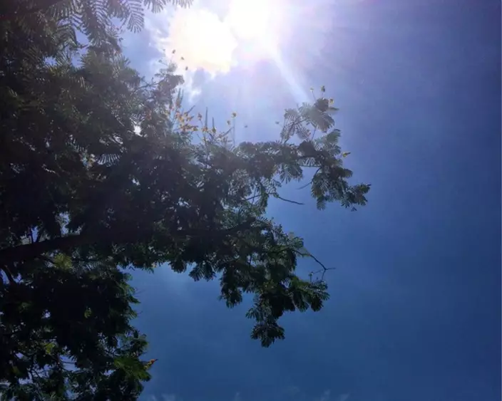 Facebook專頁「香港熱帶氣旋預警中心」指,昨日中午後,望向太陽的仰角稍為回落,陽光被大氣高層一絲絲的「卷雲」折射,令天空染上彩色。