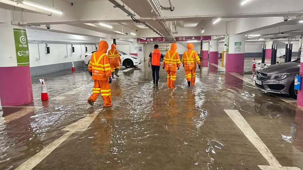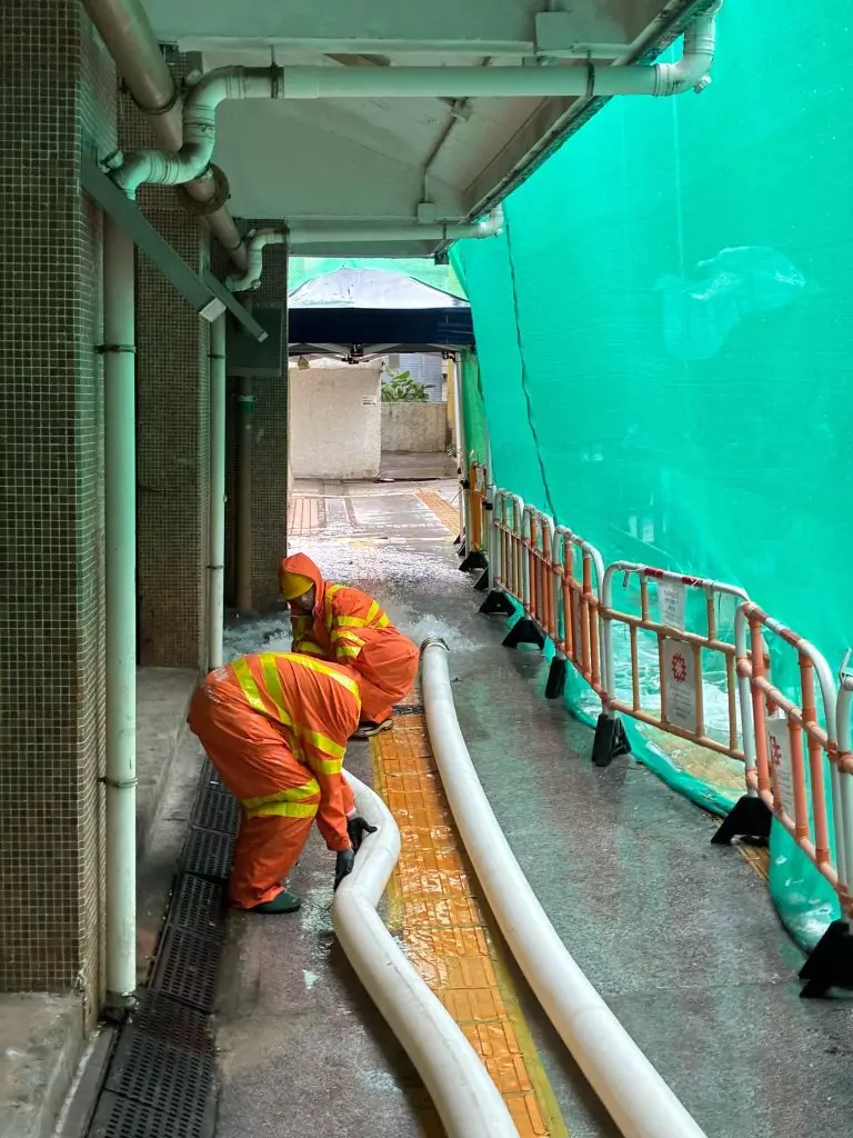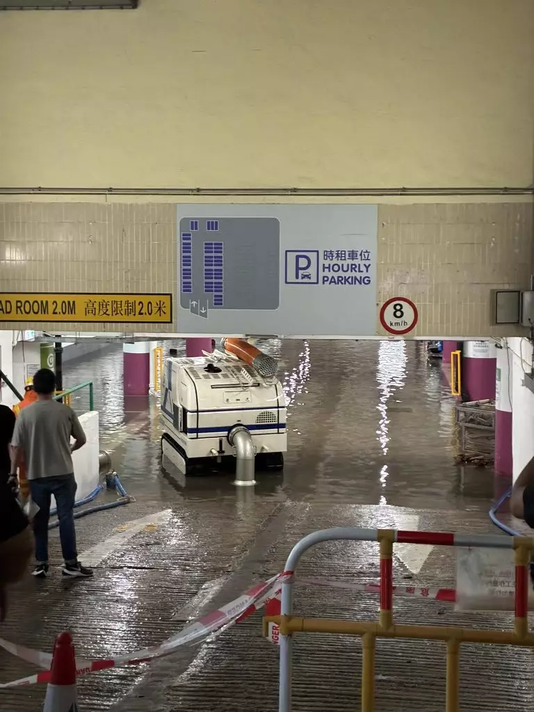 環翠邨商場停車場內,有渠務署人員用水泵抽走車場內的積水。到場視察的立法會議員梁𤋮表示,環翠邨商場停車場已經不是第一次水浸,過去暴雨發生時也有類似情況。他指出,涉事的停車場內沒有內置的大型電動水泵,每當水浸只能依靠渠道去水,商場在水浸後兩小時才設置水閘,但水閘高度大約及膝,根本不足以阻擋水流。