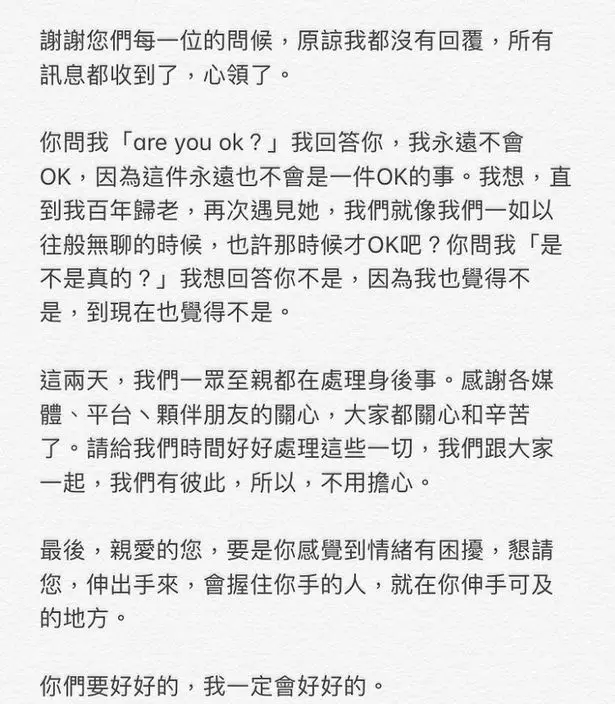 林二汶稱,感謝每一位的問候,如「問我『are you ok?』我回答你我永遠不會OK,因為這件事永遠也不會是一件OK的事。我想直到我百年歸老,再次遇見她我們就像我們一如以往般無聊的時候,也許那時候才OK吧」。林二汶直言,「你問我『是不是真的?』我想回答你不是,因為我也覺得不是,到現在也覺得不是。」