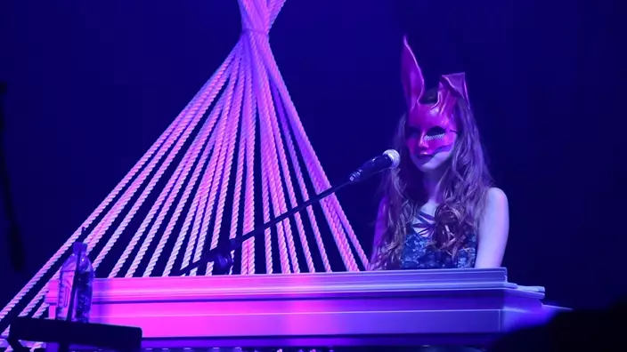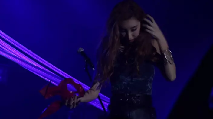 Angela決定以「小背心」的名義開一場小型音樂會,並即場對着粉絲揭開面紛,公開身分。(網上圖片)
