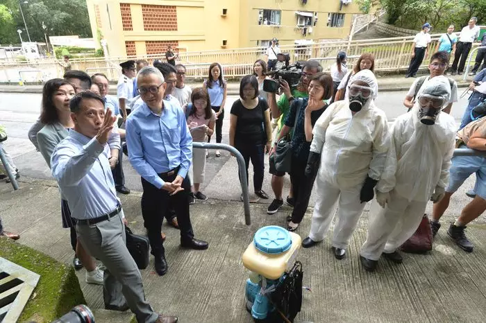 食物及衞生局副局長徐德義,到其中1名患者居住的葵盛西邨視察滅蚊工作。