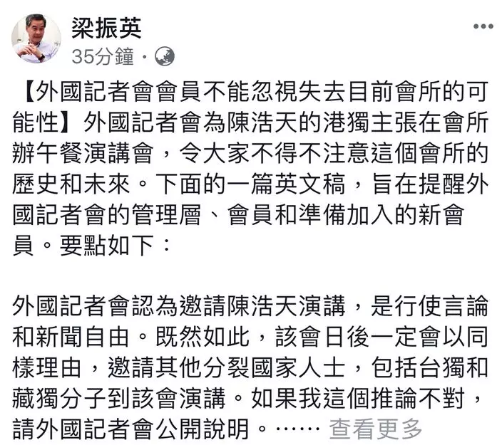 前特首梁振英就外國記者協會(FCC)邀請香港民族黨創辦人陳浩天演講一事,再度發炮,這次就指外國記者協會會址不是公開競投,指2023年租約到期時,大有不獲續租的風險。