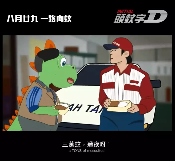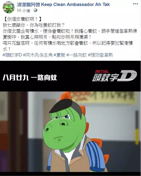 登革熱個案愈來愈多,要避免登革熱就要做好防蚊措施。清潔龍阿德今在Facebook發片,將經典電影《頭文字D》改編成《頭蚊字D》,提醒市民預防登革熱,隨即引起網民熱論。