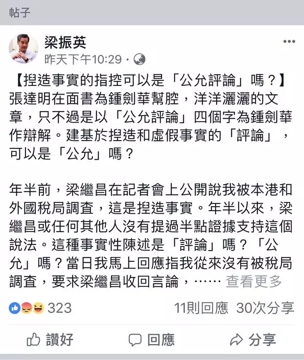但CY就認為那些人對他的並非「公允評論」,他昨日在facebook再發言反駁,質問揑造事實的指控可以是「公允評論」嗎?CY指張達明在面書為鍾劍華幫腔,洋洋灑灑的文章,只不過是以「公允評論」四個字為鍾劍華等人作辯解。建基於揑造和虛假事實的「評論」,可以是「公允」嗎?