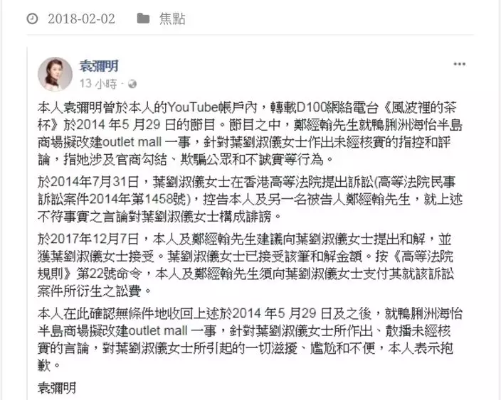 袁彌明今年2月在facebook公開道歉