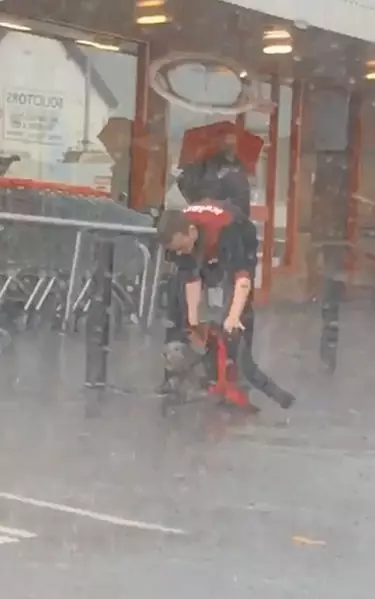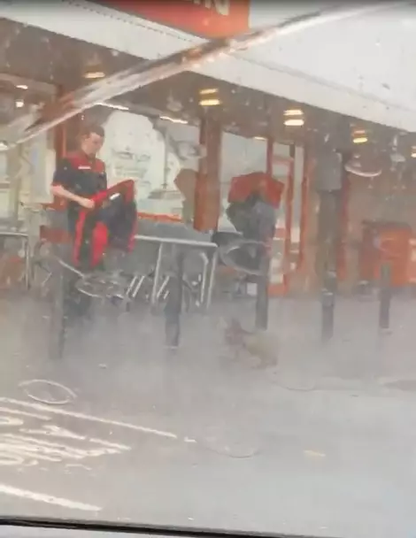 另外,雖然短片中沒有拍下,不過當時亦有另一名女員工為小狗解開狗帶,並帶到店內避雨。