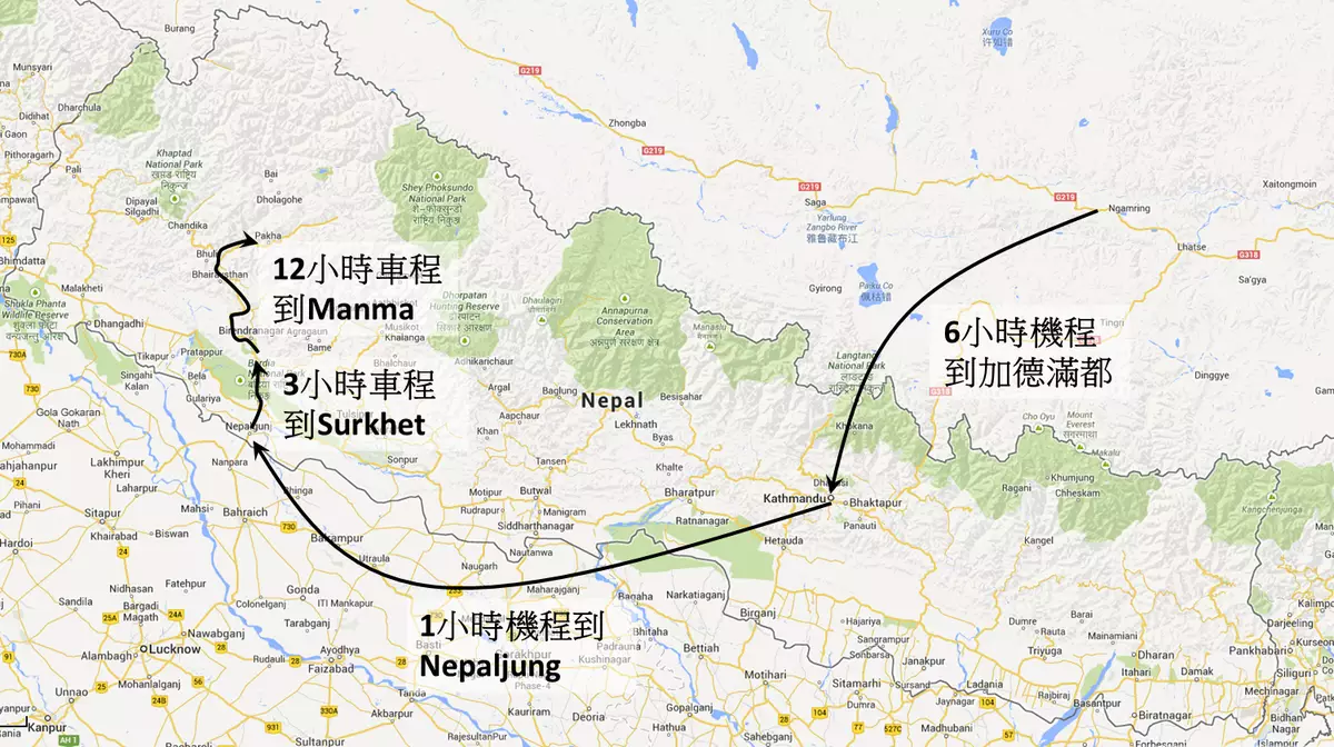 因為工作關係,到了尼泊爾一個非常偏僻村莊工作九日,我一直在想,因為地理位置異常偏僻,我們一定是首十名到訪這個村莊的香港人。我們首先搭乘飛機到尼泊爾首都加德滿都(約6小時),再搭一程內陸機到西南部城市Nepaljung(1小時),要坐四驅車到Surkhet(3小時),再坐四驅車到達Manma(12小時),沒錯,我們一共用了整整三日才到了目的地,而那個村莊叫Manma。