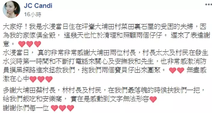 該名網民JC Candi‎在Facebook群組「Fanling 粉嶺」上發貼,表示自己是水浸當日住在坪輋大埔田村菜田裏石屋的受困的夫婦,並表示自己傢俱全毀,並且忙於清理和照顧兩個仔仔,所以「遲來了表達謝意。」