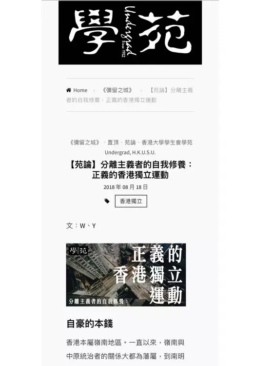 你覺得中大學生會會長講得激?未算。港大學生會刊物《學苑》一篇文章更激,8月18日的學苑有一篇文章,題為 「分離主義者的自我修養--正義的香港獨立運動」,文章作者只是代號W.Y。