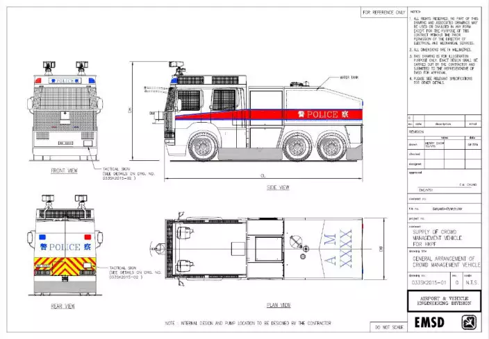 新款水炮車車頂置有兩支主炮,車內設置3個水缸供水,主炮每分鐘可射水1200公升,射程達50米,比現時改裝的水炮車射程遠很多,水炮車前後4個角更設有閉路電視,監察外圍環境。