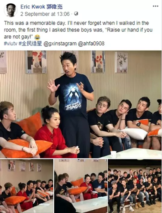 音樂人郭偉亮(Eric Kwok)為ViuTV選秀節目《全民造星》擔任導師,日前他在社交平台甫出與參賽者的合照,以英文留言問:「我永遠唔會忘記當我行入房,第一件事我就問這些男仔:『如果你不是同性戀者,請舉手!』」文尾加上笑到喊的Emoji,並Tag了節目拍檔、曾公開出櫃的卓韻芝。