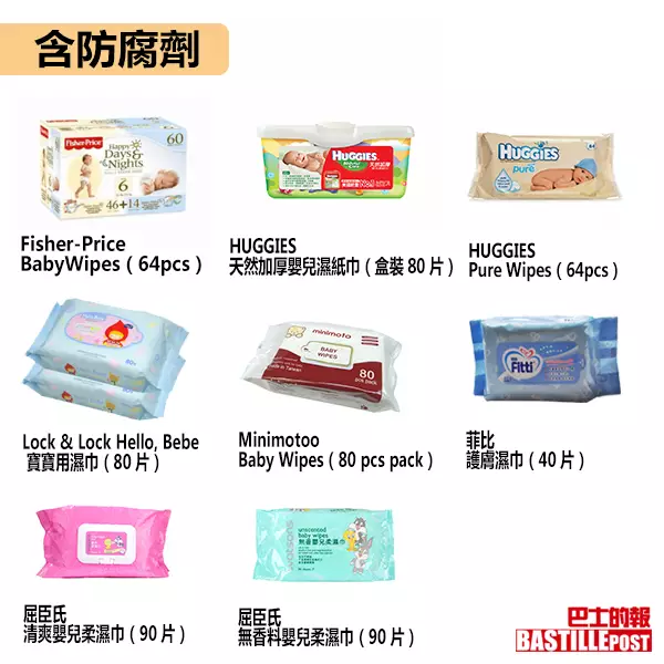 含有防腐劑的品牌包括:Fisher-Price 的「BabyWipes(64pcs)」。HUGGIES的「天然加厚嬰兒濕紙巾(盒裝80片)」、「 Pure Wipes(64pcs)」兩款濕紙巾。Lock & Lock Hello, Bebe 的「 寶寶用濕巾(80片)」。Minimoto的「 Baby Wipes(80 pcs pack)」。萬寧出的「嬰兒潤膚柔濕巾(90片裝)」。屈臣氏牌「清爽嬰兒柔濕巾(90片)」及「無香料嬰兒柔濕巾(90片)」。還有菲比的「 護膚濕巾(40片)」。